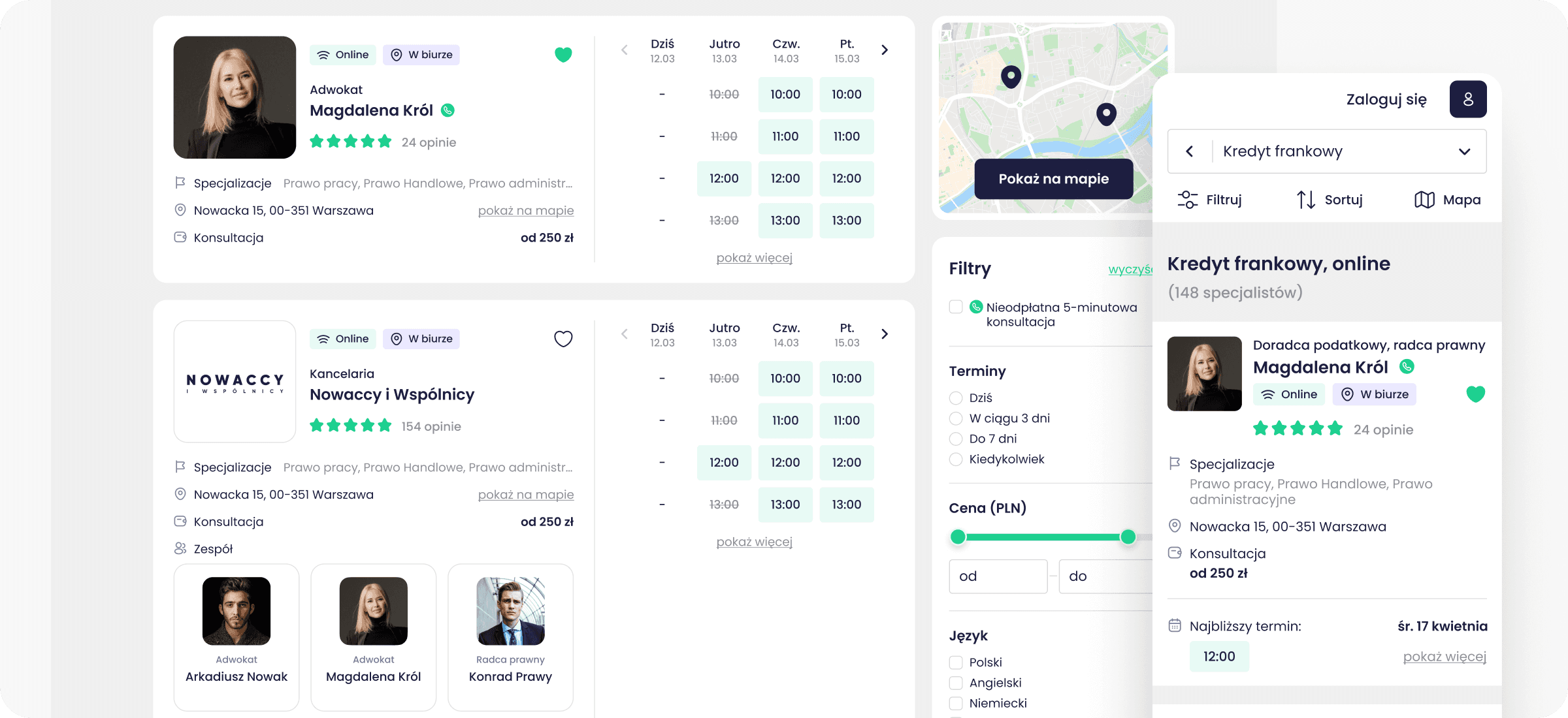 I designed a SaaS platform catering to both users and lawyers. Users can search for lawyers by location, specialty, and price, compare profiles, book appointments, and leave reviews. Lawyers can manage calendars, build profiles, set pricing, and schedule availability. The key design challenge was creating intuitive views for setting recurring work hours across multiple locations and developing a mobile-friendly pricing interface. Additionally, I ensured the “Free 5-Minute Consultation” was easily accessible on mobile.