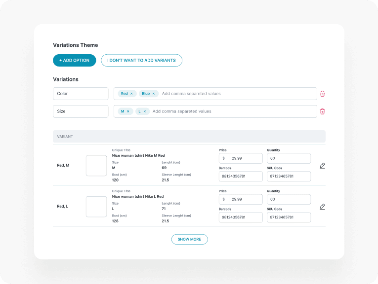 I designed an intuitive, user-friendly e-commerce platform. The main challenge with this project was to create a process for adding new products that have variants (e.g. color). Additionally, the entire home page, product listing, and selected product display were designed.